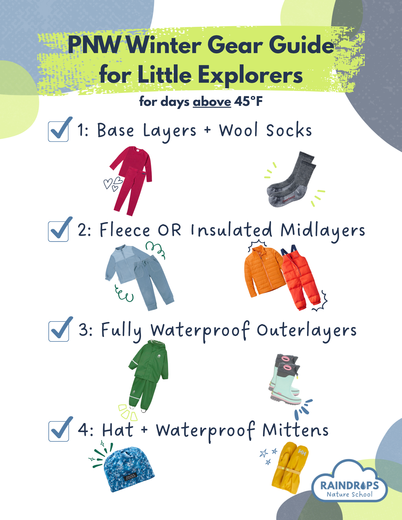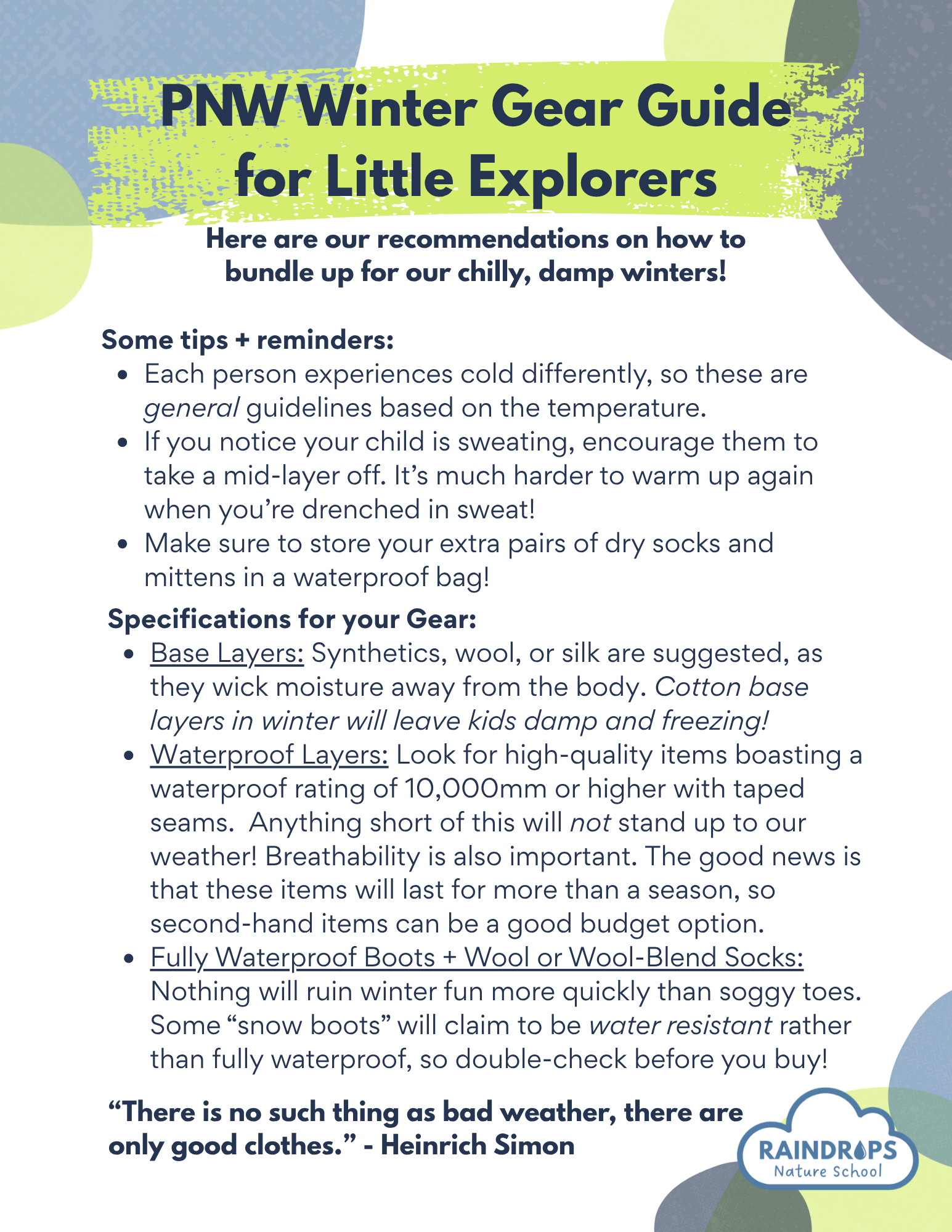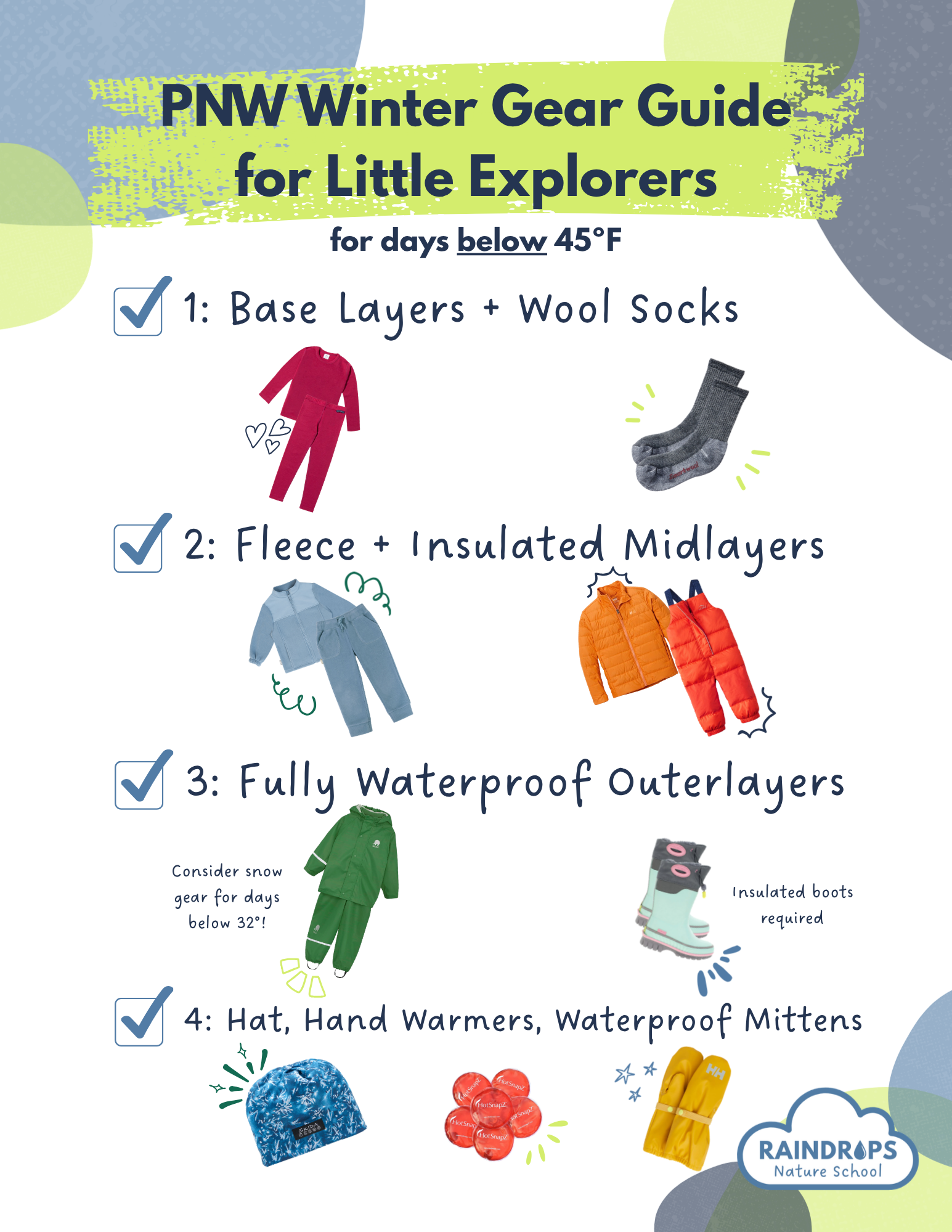 Our goal at Raindrops is to foster a healthy relationship between our students and the natural world. This is why so much attention has been placed on gear to help your children thrive at school. We do not want to cause any undue stress or discomfort as this would work against our core values. Physical safety and care are placed first and foremost to ensure the children are comfortable and able to learn. When children are physically uncomfortable it is very hard for them to access their higher level thinking as they are likely operating from their “fight or flight” mode. When one child is uncomfortable and or underdressed, we will likely have parents either bring more clothing or send the child home depending on what time it is. If half the class is struggling due to cold and wet, we will cancel class. We want children to have positive and healthy memories of their time in nature.